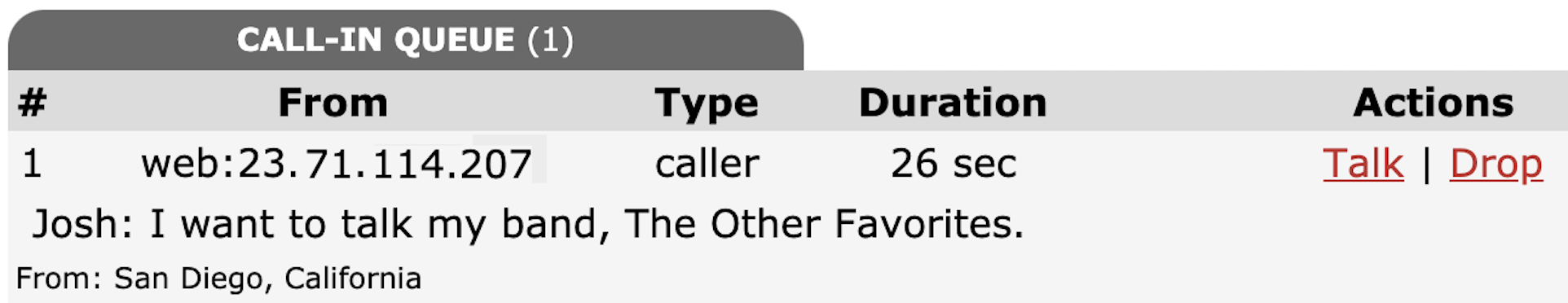 Callers will be asked to enter their name and the subject they are calling about. Once their request is submitted, they will be queued to connect to your show or meeting. If there is an open line available, they will confirm their desire to connect and the call will be initiated.